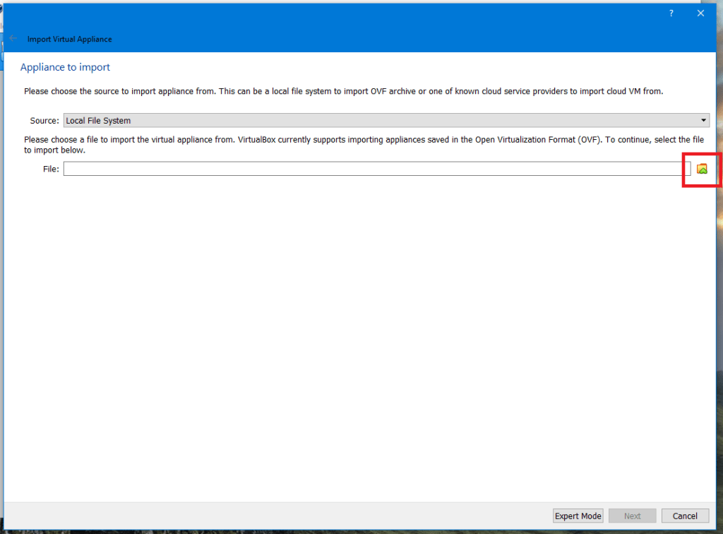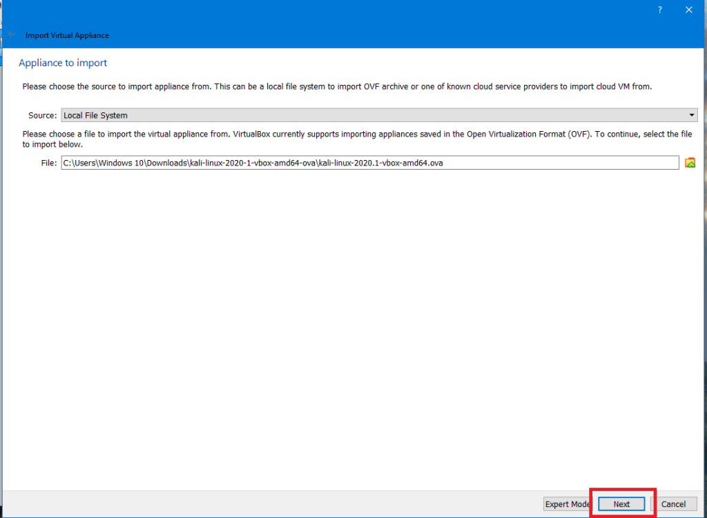 B4: Vào thư mục nơi lưu máy ảo Kali đã tải và click Open