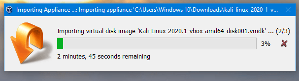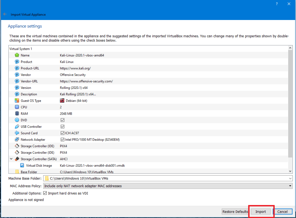 B6: Click Import. Thông số ở cửa sổ bên trên chính là của máy ảo Kali, theo đó chúng ta sẽ có một máy Kali 2 CPU, 2 GB ram, bộ nhớ trong 90 GB với 78 GB khả dụng và một hệ điều hành x64