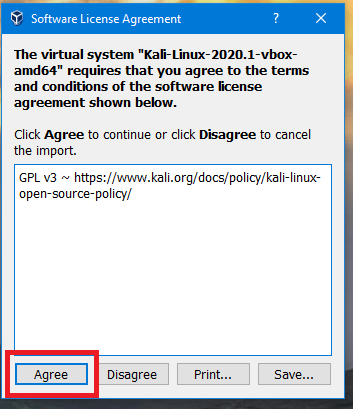 B7: Click Agree để chấp nhận những điều kiện, ràng buộc khi sử dụng Kali Linux từ công ty Offensive Security. Bạn có thể theo đường link hiện ra trong cửa sổ để tìm hiểu thêm về những điều kiện, ràng buộc này.