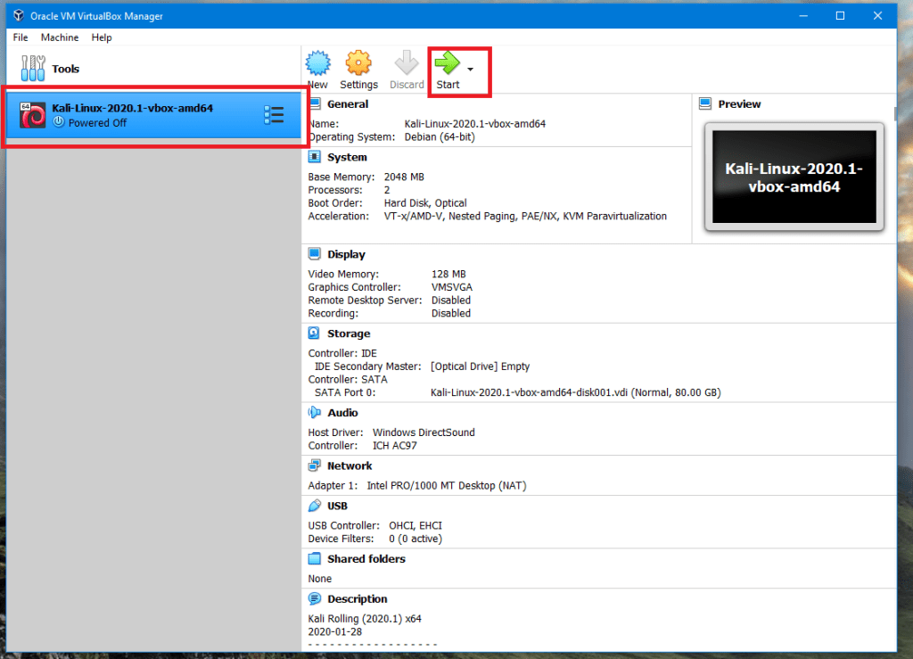 B9: Sau khi tải máy ảo xong, các bạn click vào máy ảo ở vùng bên trái và bấm start, để khởi động máy Kali