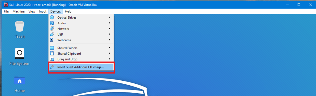 B1: Trên thanh menu của cửa sổ Kali Linux, bấm chọn Devices > Insert GuestAdditions CD Image