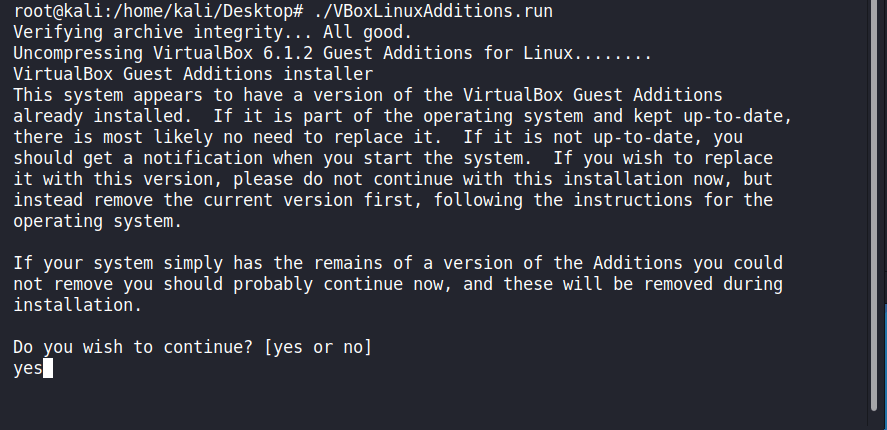 B7: Máy sẽ hỏi bạn, nếu trong quá trình cài đặt, máy phát hiện phần mềm GuestAdditions version cũ đã có trong máy, máy sẽ hủy phần mềm cũ và cài đặt phần mềm mới, bạn có đồng ý không, bạn sẽ gõ yes