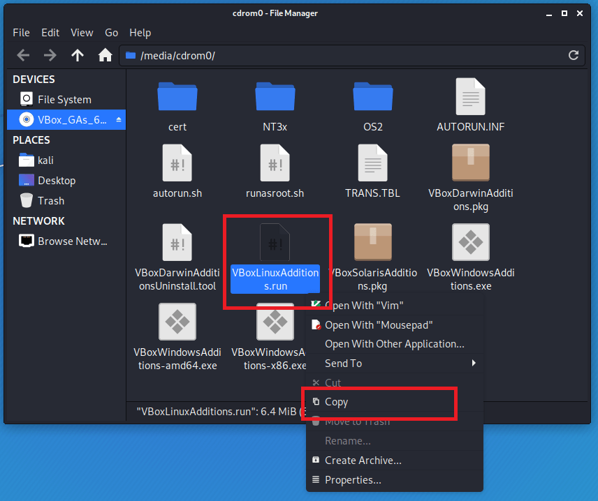 B3: Trong cửa sổ hiện ra, các bạn copy file VBoxLinuxAdditions.run ra màn hình Desktop của Kali Linux