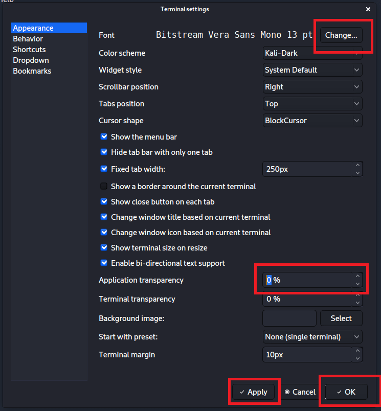 B5.2: Click change để thay đổi font chữ cũng như cỡ chữ. Sau đó chuyển thông số Application transparency về 0%. Click Apple và Ok