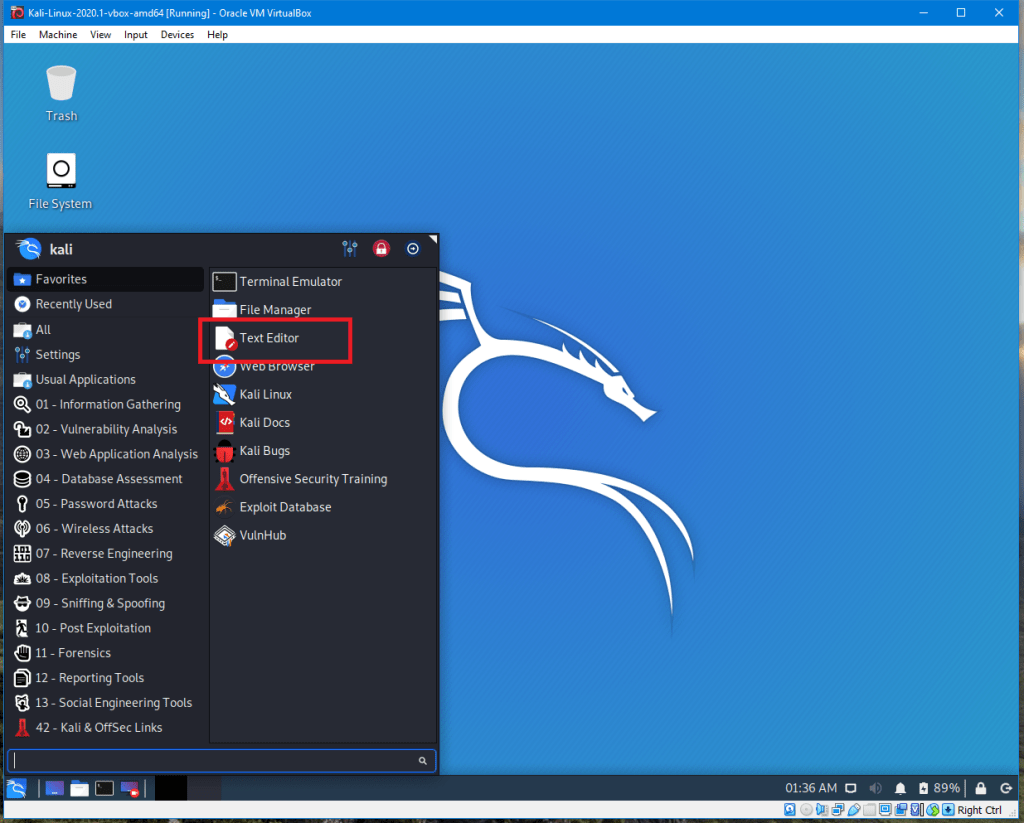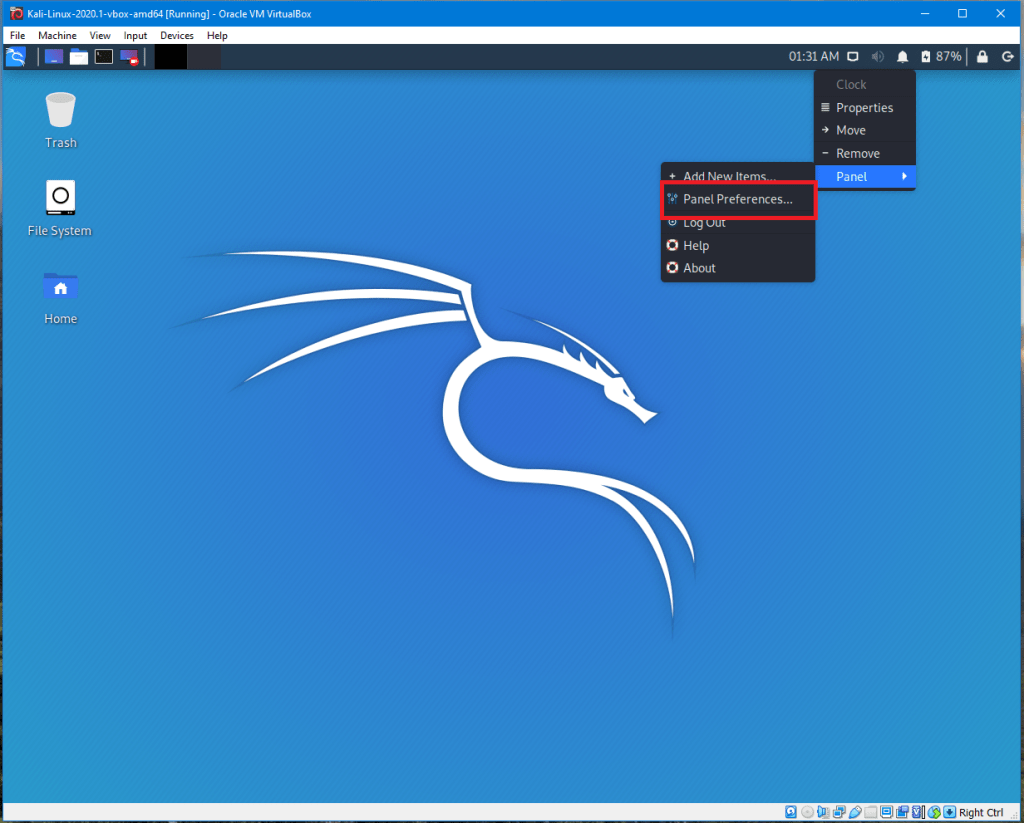 B12: Giao diện chính của Kali Linux 2020.1. Bạn nào không thích thanh menu nằm trên cùng có thể theo các bước sau để chuyển thanh menu xuống dưới như trên Windows. Còn không bạn có thể đến mục 3.