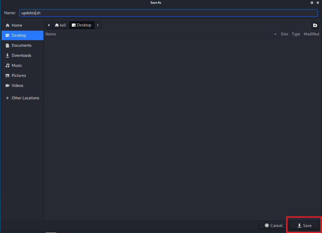 B3: Click File > Save lưu lại file với tên updates.sh trên Desktop, sau đó click Save