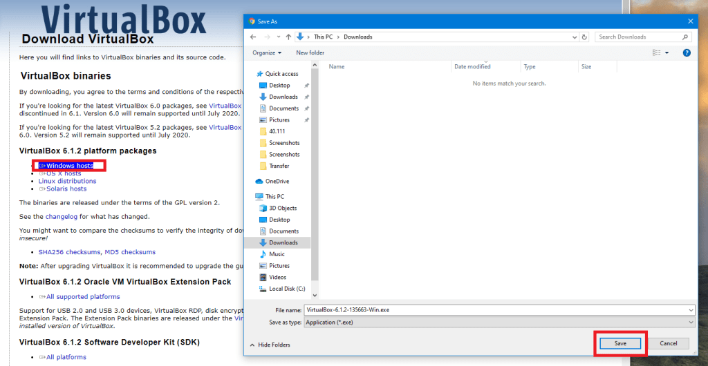 B2: Click chọn Windows hosts (bản VirtialBox dành cho Windows) và chọn nơi lưu file cài đặt rồi bấm Save