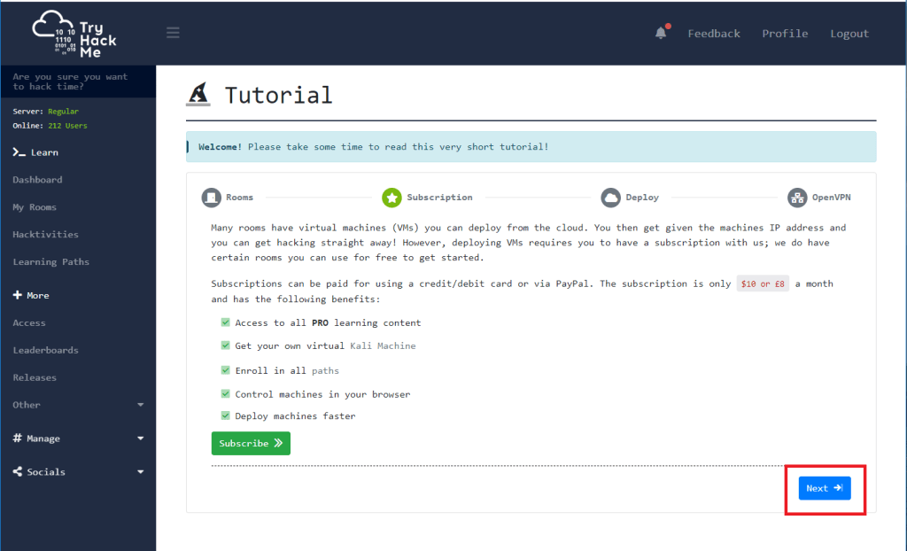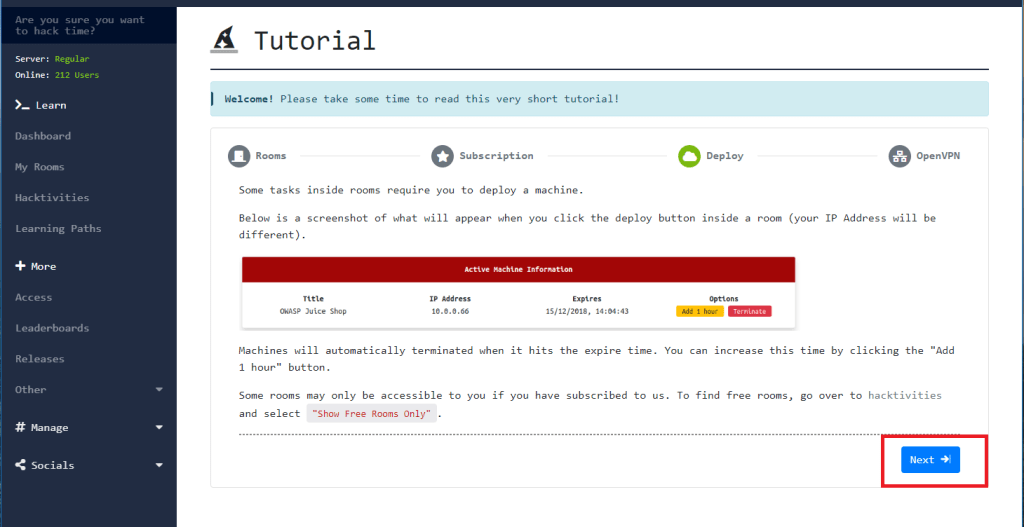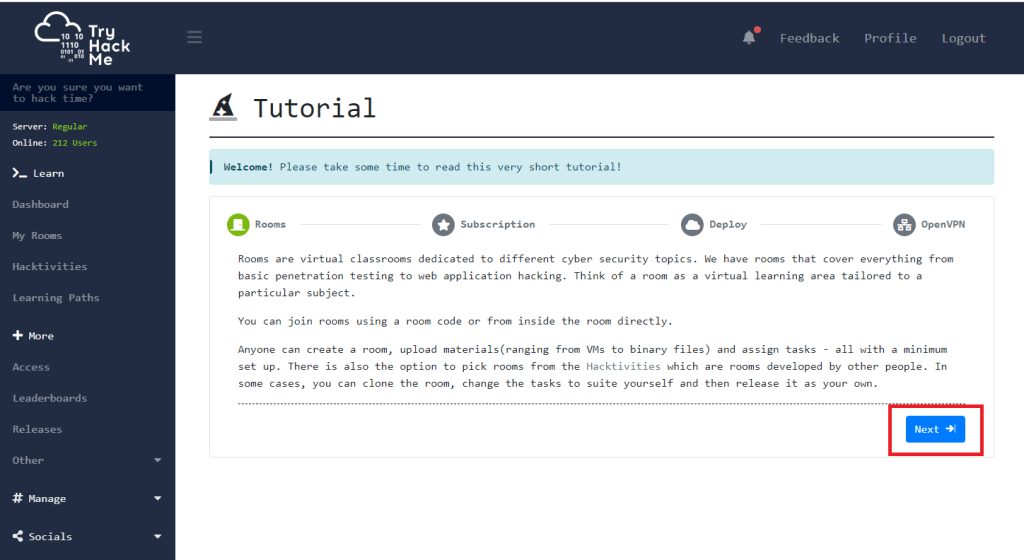 B2: TryHackMe sẽ có vài lời giới thiệu về hệ thống của họ. Các bạn có thể tự tìm hiểu sau đó bấm Next.
