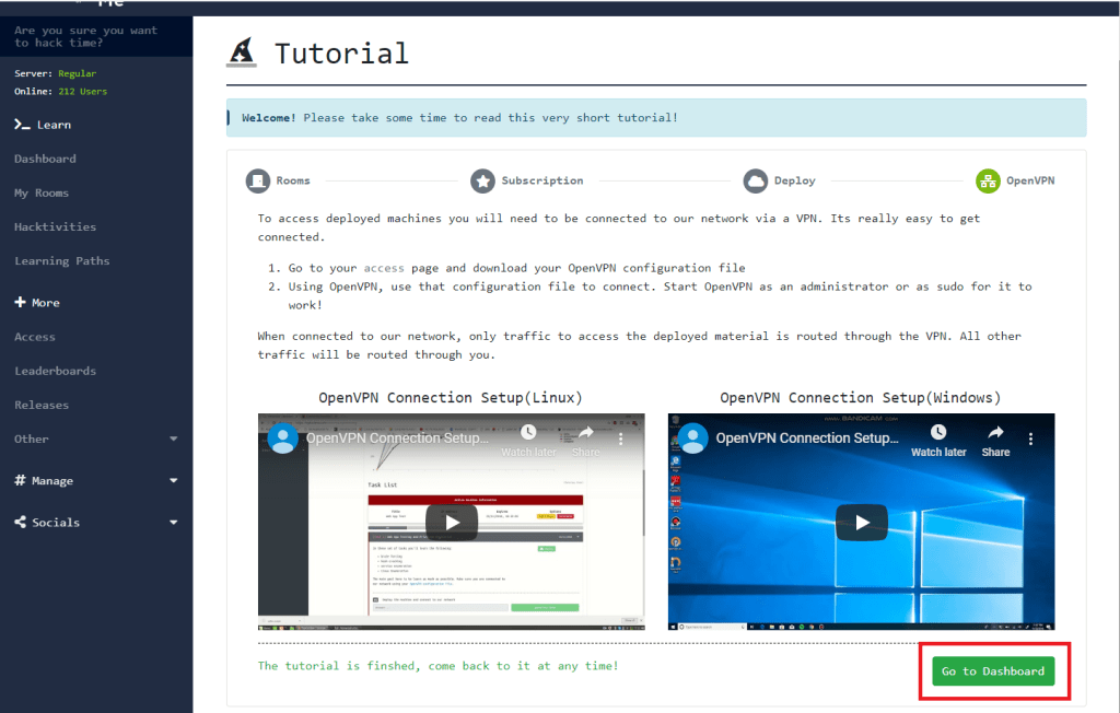 B5: Để luyện tập, bạn cần phải kết nối với máy chủ của TryHackMe bằng phần mềm OpenVPN. Kali Linux đã có sẵn OpenVPN nên bạn không cần phải cài thêm gì cả. Click vào Go to Dashboard.