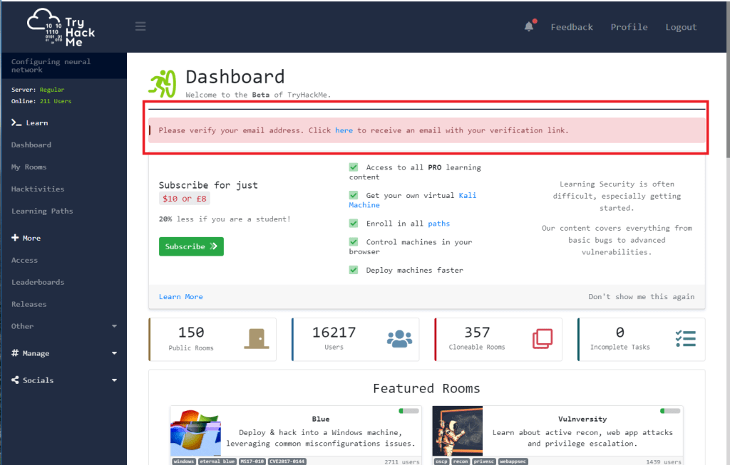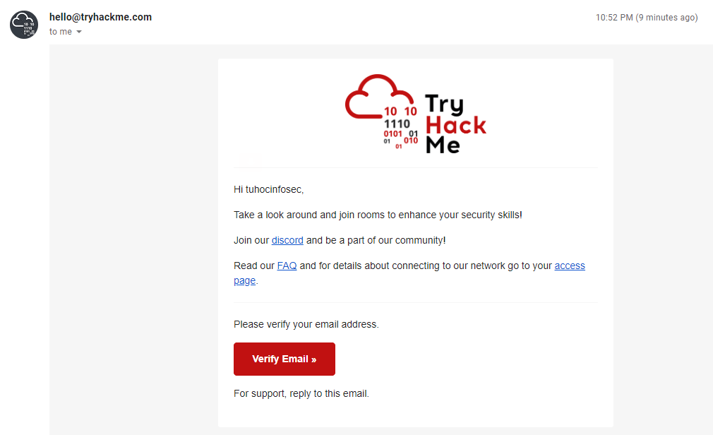 B6: Lúc này bạn cần xác nhận email của mình với TryHackMe. Bạn click vào nút here và check hộp mail của mình