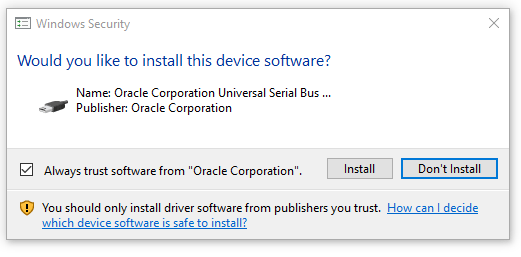B7: Trong quá trình cài đặt, Windows sẽ hỏi xem bạn có cho phép những phần mềm dùng để hỗ trợ VirtualBox được cài đặt không? Bạn chọn Install