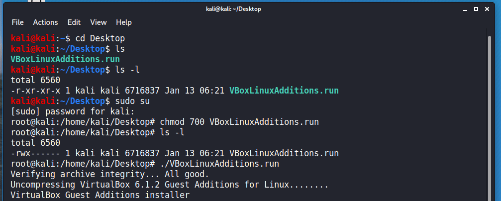 sudo su (đăng nhập quyền root/administrator hay quyền quản trị cao nhất) – Lúc này máy sẽ hỏi chúng ta mật khẩu, chúng ta nhập vào kali. Vì phần mềm GuestAdditions sẽ thay đổi hệ thống máy Kali của chúng ta, nên chúng ta cần chạy code ở đặc quyền cao nhất.