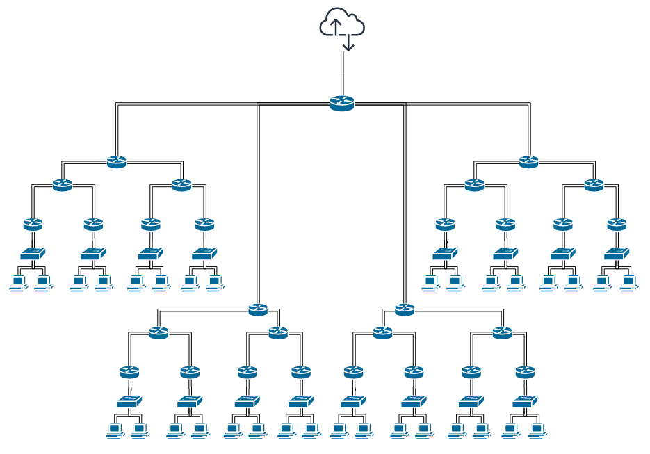 Quay trở lại bài, chúng ta sẽ có sơ đồ căn bản nhất của mạng Internet bên trên bao gồm các tổ hợp của các thiết bị căn bản nhất nhưng quan trọng nhất là routers, switches và PC/laptop như bên trên.