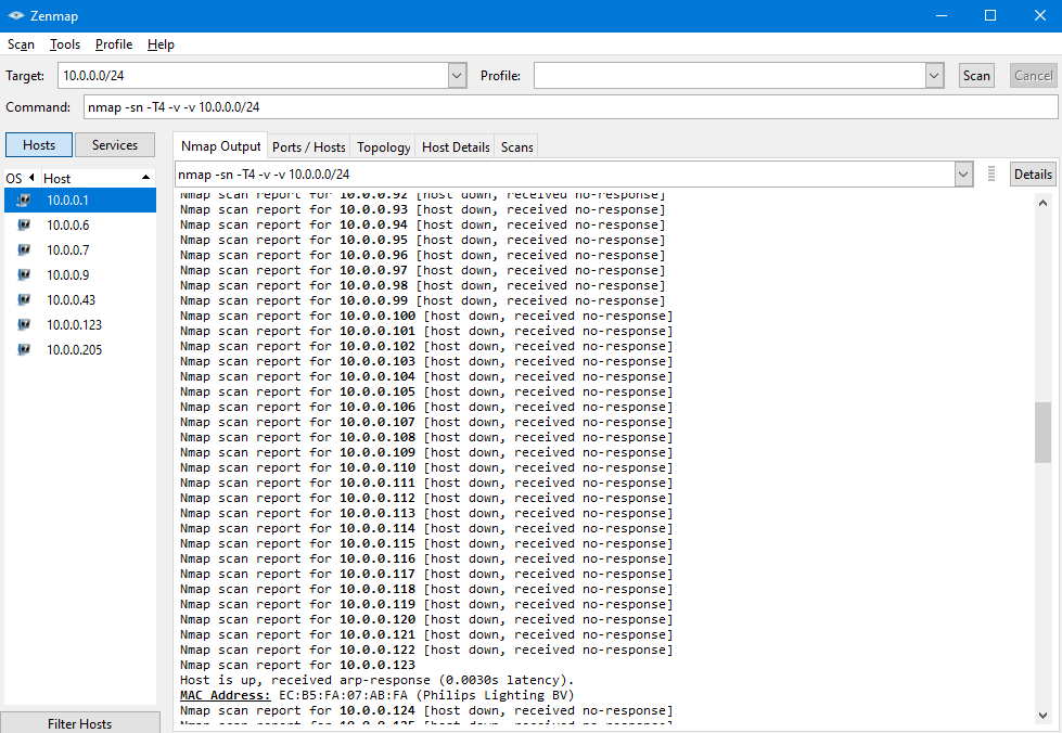 Bên dưới là ví dụ khi mình chạy zenmap, các máy đang online được liệt kê ở góc bên trái.