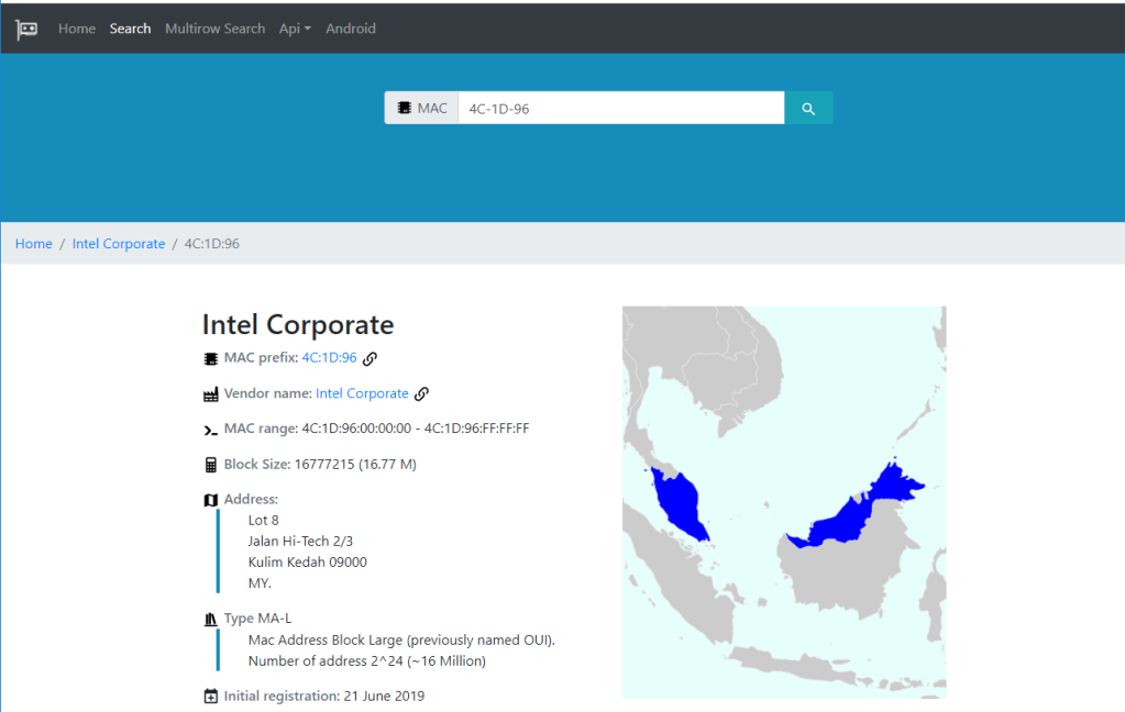 Ví dụ chúng ta có thể thử tìm địa chỉ MAC của card mạng máy tính đang sử dụng và tìm xem ai là người sản xuất chúng như sau: