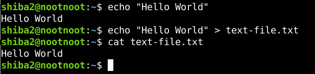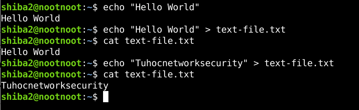 Ở ví dụ bên trên, mình đã dùng lệnh echo để in ra “Hello World”. Như bạn thấy, nếu không dùng operator “>”, echo sẽ in ra nội dung “Hello World” ở dòng tiếp theo. Khi sử dụng operator “>”, nội dung cần in không được xuất ra màn hình nữa mà được chuyển vào file text-file.txt. Các bạn dùng lệnh cat để kiểm tra nội dung file sẽ thấy nội dung cần in “Hello World” ở bên trong.