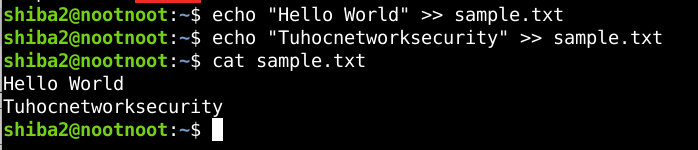 Operator “>>” có thể được dùng để thêm dữ liệu vào file đã có sẵn thay vì overwrite toàn bộ nội dung trong file đó và viết lại nội dung mới như operator “>”. Operator “>>” cũng có thể được dùng để tạo file với nội dung mong muốn