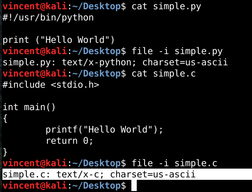 Ví dụ trong hình mình có 2 file simple.py và simple.c được mình code đơn giản để in ra dòng “Hello World”. Khi dùng lệnh file -i, bạn sẽ thấy ở giá trị thứ 2, sẽ hiện ra ngôn ngữ lập trình đã được dùng trong file ví dụ python hoặc c chứ không phải là application như hình H3 bên trên.