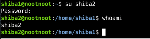Sau khi nhập câu lệnh su shiba2, hệ thống sẽ yêu cầu mình nhập password của shiba2 để đăng nhập tài khoản, bạn copy/paste lại mật khẩu đã tìm được ở task 11, sau đó enter. Lúc này bạn để ý sẽ thấy, dòng hiển thị màu xanh lá ở đầu câu lệnh đã chuyển từ shiba1 thành shiba2. Để chắc chắn, chúng ta dùng lệnh