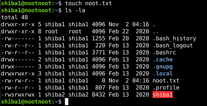 B2: Kiểm tra xem file noot.txt đã được tạo ra chưa, cũng như kiểm tra để biết file binary shiba1 có nằm trong directory hiện tại hay không bằng lệnh sau: