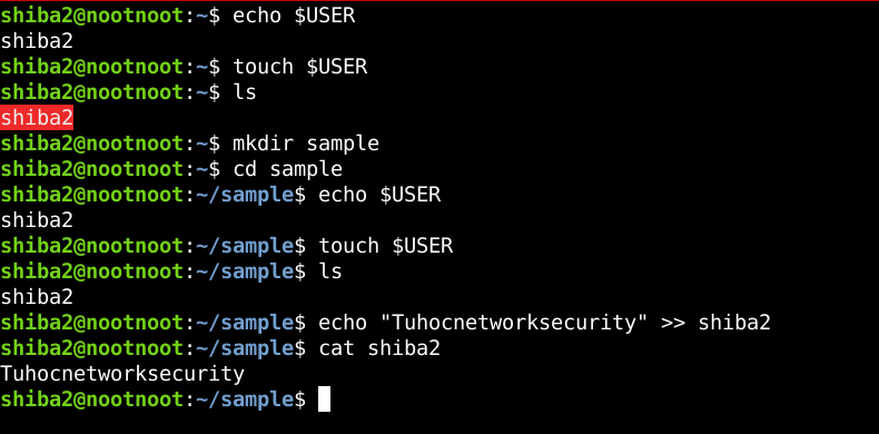- Ở bên trong directory sample, mình dùng lệnh echo để kiểm tra giá trị của biến USER một lần nữa và dùng lệnh touch để tạo một file có tên là giá trị được gán cho biến USER. Ở đây giá trị đó là “shiba2”.