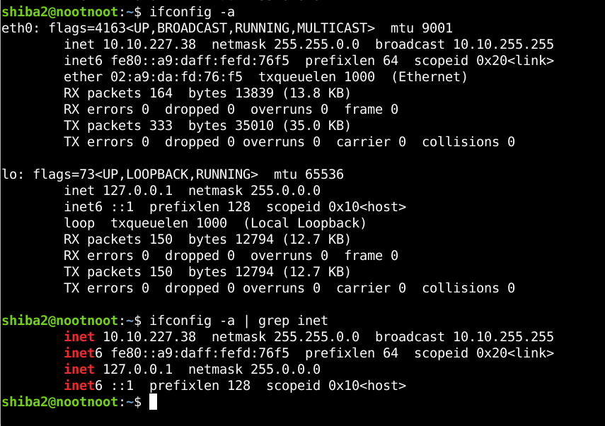 Lệnh grep có chức năng là tìm từ khóa (ở đây là inet) trong dữ liệu được cho (ở đây là output của lệnh ifconfig -a). Khi tìm được những dòng chứa từ khóa inet, lệnh grep sẽ in những dòng đó ra như ta thấy bên trên. Dựa vào kết quả được trả về, ta biết rằng máy hiện đang có 2 network interfaces. Một là network interface chính có IPv4 là 10.10.227.38/16 và một có là loopback interface có IPv4 là 127.0.0.1/8.