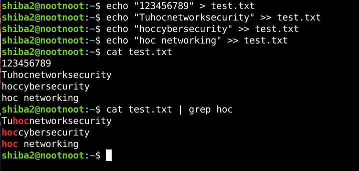 Ở đây, chúng ta dùng lệnh echo tạo một file có tên test.txt. File này chứa 4 nội dung khác nhau. Để kiểm tra xem trong file những dòng nào chứa từ khóa “hoc” chúng ta sẽ sử dụng lệnh cat để in nội dung của file ra sau đó chúng ta dùng pipeline lấy output của lệnh cat và chuyển vào lệnh grep để tìm từ khóa “hoc”. Và kết quả chúng ta đã tìm được 3 dòng có chứa từ “hoc” trong file test.txt.