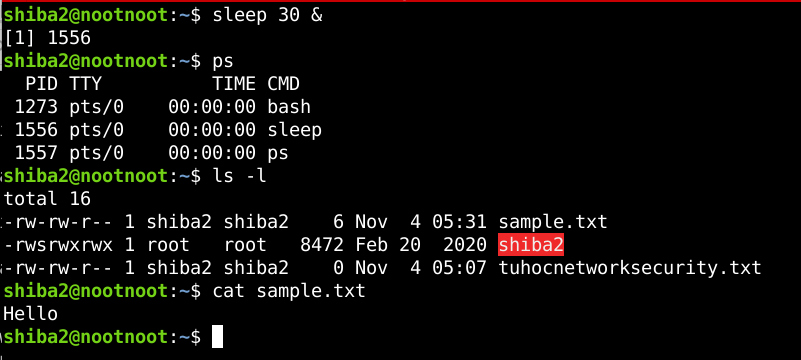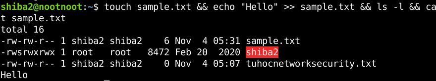 - Mình dùng lệnh ls để show ra toàn bộ file và directory đang có trong directory hiện tại, thì thấy file shiba2 đã được tạo.