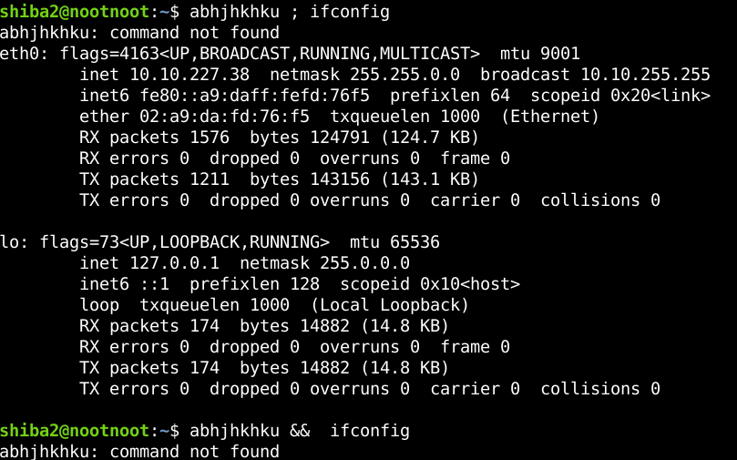 Trong ví dụ bên trên, ở bên trái của operator “;” mình cố tình nhập một dãy giá trị không có nghĩa và bên phải operator “;” là lệnh ifconfig. Như bạn thấy, mặc dùng dãy giá trị “abhjhkhku” không có nghĩa và bị báo lỗi “command not found”, nhưng lệnh phía sau là ifconfig vẫn được thực thi.