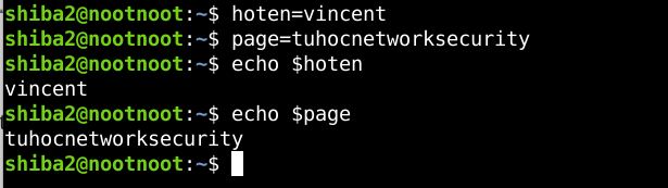 Ở hình trên mình đã tạo ra 2 biến, một là hoten và hai là page. Sau đó mình đã dùng lệnh echo để in ra giá trị đã gán cho cả 2 biến.