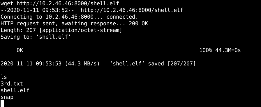 Sau khi lệnh chạy xong, bạn có thể dùng lệnh ls để kiểm tra thử. Nếu thấy file shell.elf nghĩa là bạn đã chuyển file thành công.