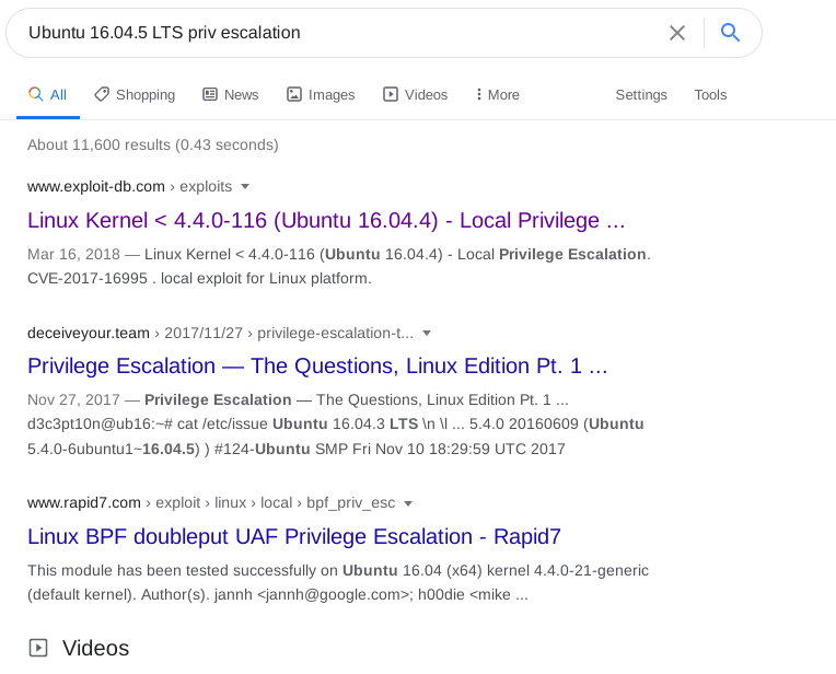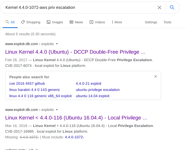 Kết hợp cả 3 điều trên có nghĩa là chúng ta cần tìm một phần mềm khai thác lỗi cho phép nâng cấp quyền quản trị trên Ubuntu 16.04.5 LTS hoặc Kernel 4.4.0-1072-aws được viết bằng Bash, Perl, C hoặc có đuôi .elf (file thực thi trên Linux).