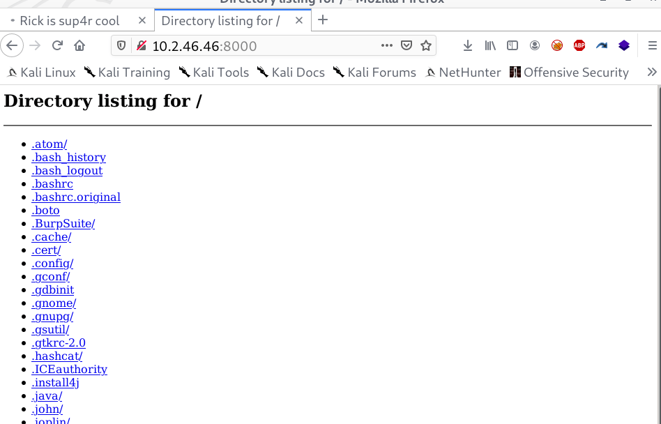 Câu lệnh trên sử dụng một module của Python có tên là SimpleHTTPServer để biến directory hiện tại thành một webserver cho phép trao đổi file tại port 8000 với địa chỉ IP là IP của hacker. Webserver này có thể được truy cập bởi tất cả các máy ở trong cùng mạng và đương nhiên là cả server Pickle Rick nữa.