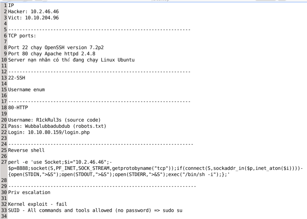 Một lưu ý với các bạn là mỗi khi bạn tắt và mở lại server Pickle Rick trên TryHackMe, server sẽ được tự động gán cho một IP address mới. Địa chỉ IP của bạn được cấp bởi VPN server của TryHackMe mỗi lần cũng có thể khác nhau. Nếu IP khác nhau, thì bạn nhớ cập nhật lại IP mới trong file text nhé.