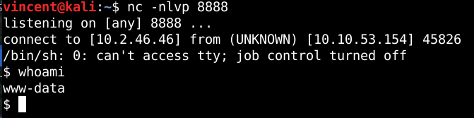 Nói tóm lại, câu lệnh trên có nghĩa là chúng ta sẽ mở port 8888 trên máy Kali Linux để lắng nghe xem có reverse shell đến hay không. Nếu có reverse shell đến, nc sẽ bắt lấy và thiết lập kết nối.