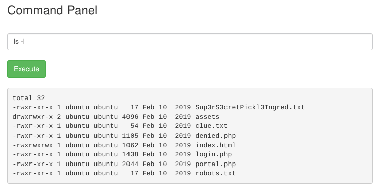 -rwxr-xr-x 1 ubuntu ubuntu 17 Feb 10 2019 Sup3rS3cretPickl3Ingred.txt