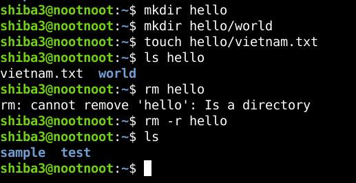 Lỗi xảy ra vì để xóa được directory, chúng ta phải thêm flag -r theo sau lệnh rm.
