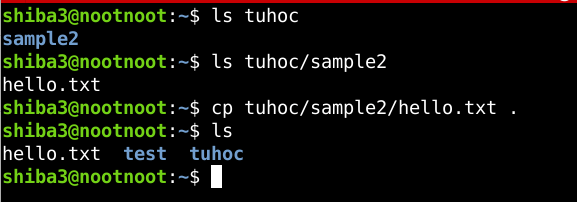 Chúng ta sẽ thực hành copy file hello.txt từ directory sample2 và lưu ở HOME directory của shiba3. Chúng ta sẽ sử dụng lại những directories và file đã tạo khi thực hành câu lệnh mv nhé. Để thực hành ví dụ này, ta sử dụng câu lệnh sau
