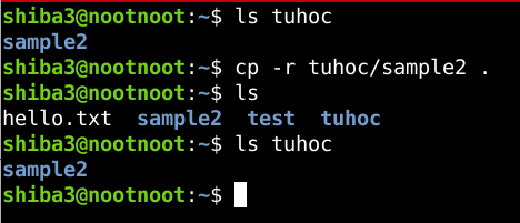 Chúng ta sẽ copy directory sample2 kèm nội dung ra HOME directory của shiba3. Câu lệnh như sau