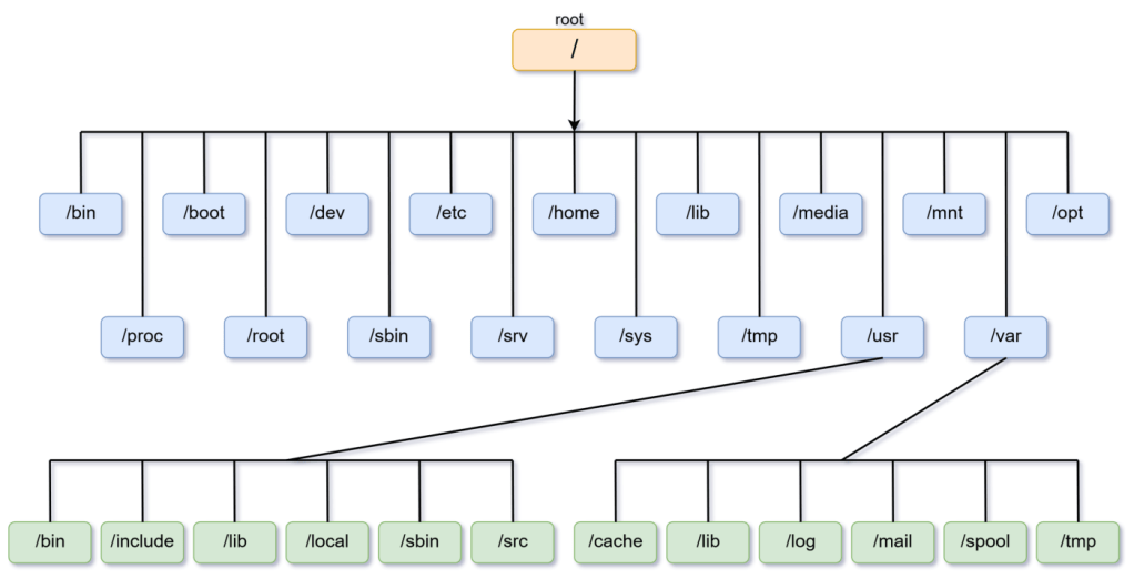 Nằm ở đỉnh của sơ đồ là directory /, hay còn được biết đến với cái tên root directory. Tất cả các directories hệ thống của Linux đều là con của directory root.