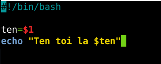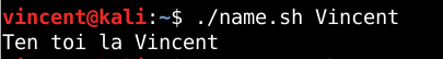 Trong đoạn script trên, mình đã sử dụng một kỹ thuật để file script nhận dữ liệu từ bên ngoài file, cụ thể là ở dòng lệnh dùng để thực thi file. Sau đó, dữ liệu nhận được, là tên của mình, sẽ được gán cho variable ten ở bên trong file name.sh. Khi xuất kết quả ra, mình đã gọi variable ten ($ten) để lấy kết quả được gán và ghép vào dòng chữ mình muốn in. Và ta có kết quả như trên.