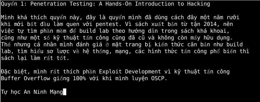 Mình khá thích quyển này, đây là quyển mình đã dùng cách đây một năm rưỡi khi mới bắt đầu làm quen với pentest. Vì sách xuất bản từ tận 2014, nên việc tự tìm phần mềm để build lab theo hướng dẫn trong sách khá khoai, cũng như một số kỹ thuật tấn công cũng đã cũ và không còn mấy hữu dụng. Thế nhưng cá nhân mình đánh giá ở mặt trang bị kiến thức căn bản như build lab, tìm hiểu sơ lược về hệ thống, mạng, các hình thức tấn công phổ biến thì sách lại làm rất tốt.