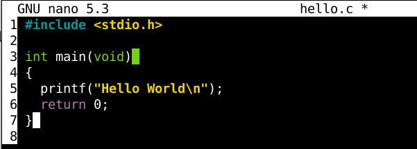 B1: Các bạn tạo file hello.c với Nano, tuy nhiên lần này, chúng ta sẽ sử dùng thêm flag -l để hiện ra số dòng