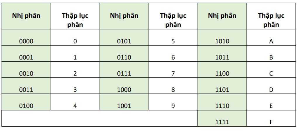 Khi biểu diễn số hex dưới dạng số nhị phân (chỉ bao gồm 0 và 1), chúng ta sẽ cần 4 bit nhị phân để biểu diễn một giá trị thập lục phân. Vì: