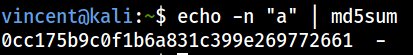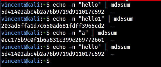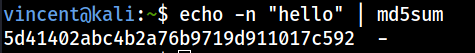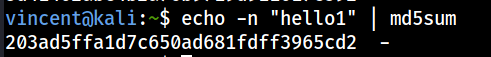 vincent@kali:~$ echo -n "hello1" | md5sum