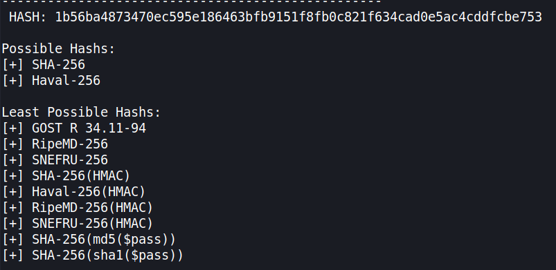 Và chúng ta có thể thấy, SHA-256 nằm trong nhóm Possible Hashs. Như vậy, Hash Identifier đã xác định đúng thuật toán hash.