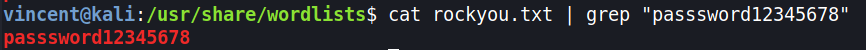 vincent@kali:/usr/share/wordlists$ cat rockyou.txt | grep "passsword12345678"